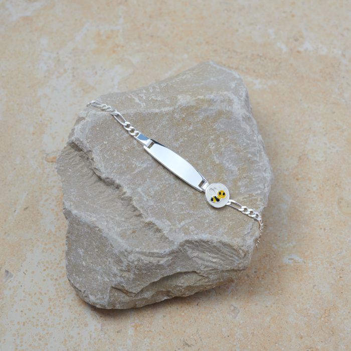 Dieses Kinderarmband trägt eine personalisierbare Gravurplatte sowie das Motiv einer süssen Biene aus Emaille. Die hochwertige Verarbeitung des 925er Silbers macht das Armband für Kinder angenehm und leicht zu tragen. Das robuste Figaro-Gliederdesign sorgt für sicheren Halt – und das Schweizer Handwerk für höchste Qualität.