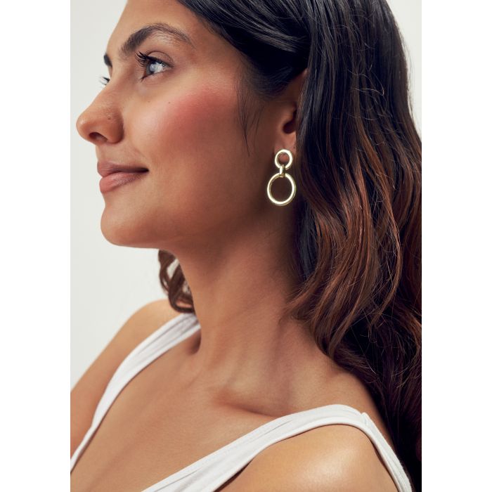 Goldene Ohrstecker, bestehend aus zwei Kreisen. Für einen warmen, eleganten Look.